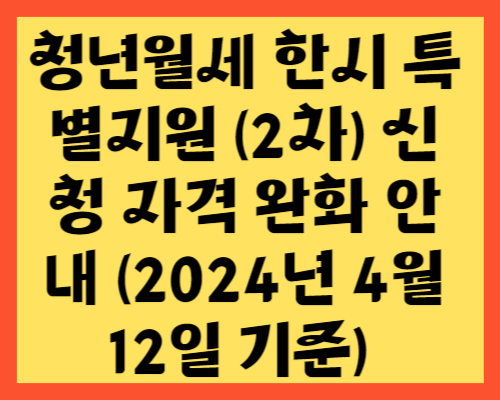 청년월세 한시 특별지원 (2차)의 신청 자격이 2024년 4월 12일부터 완화되었습니다. 이제 더 많은 청년들이 월세 지원 혜택을 받을 수 있게 되었습니다. 본 안내글에서는 변경된 신청 자격, 신청 방법, 지원 대상 등을 자세히 알려드립니다.